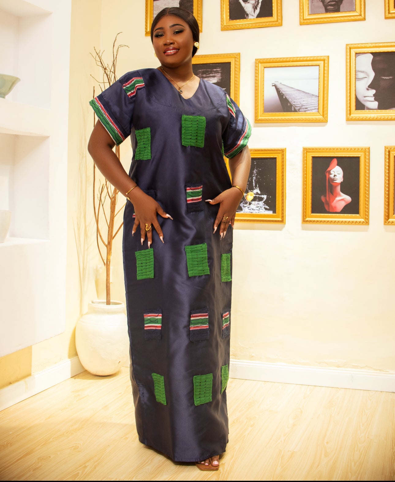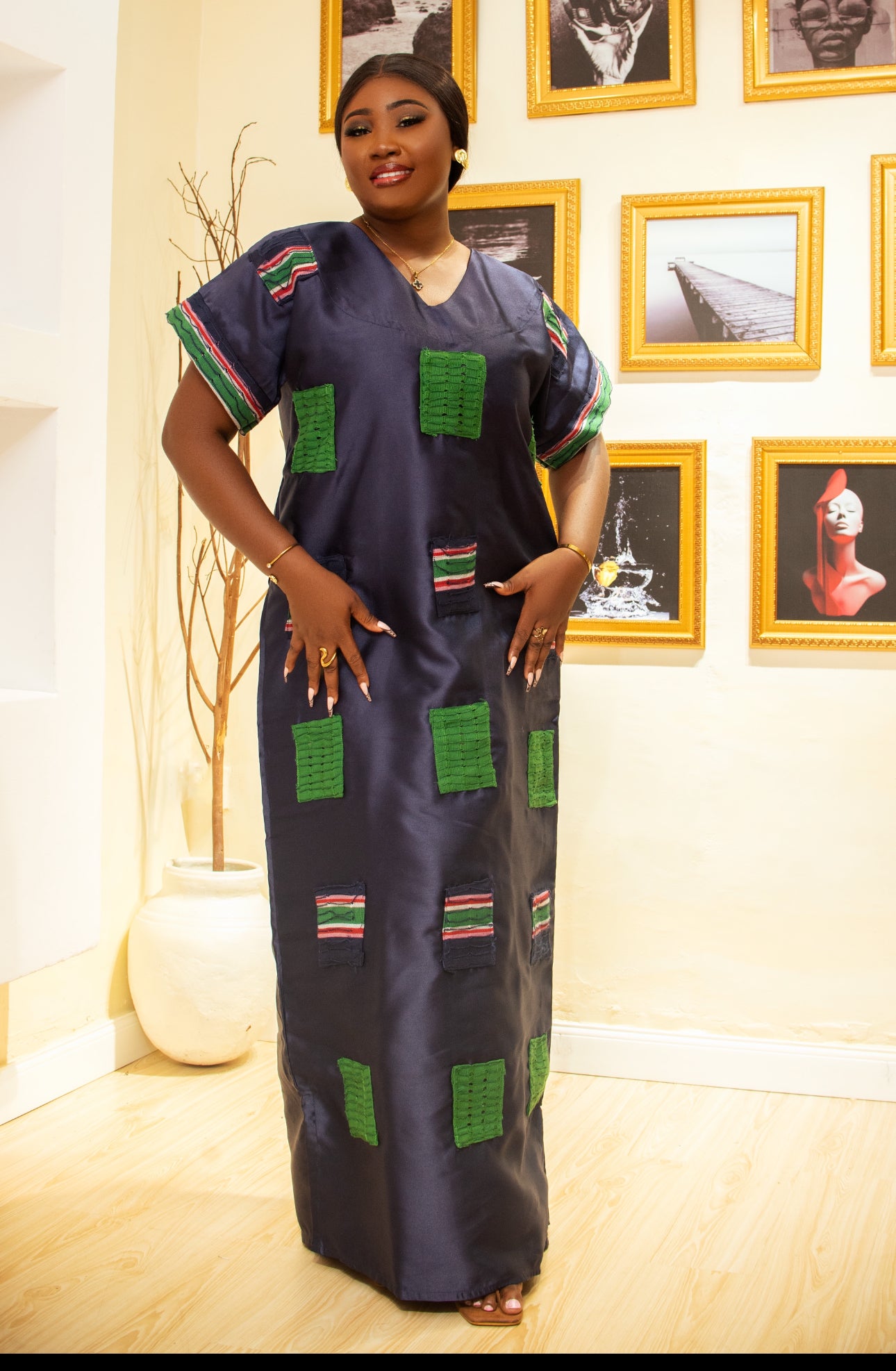 Expertly crafted with navy blue mikado fabric and adorned with traditional aso oke patches, the Amina Kaftan is a stunning addition to any wardrobe. Immerse yourself in the rich cultural history of the fabric while looking effortlessly elegant.