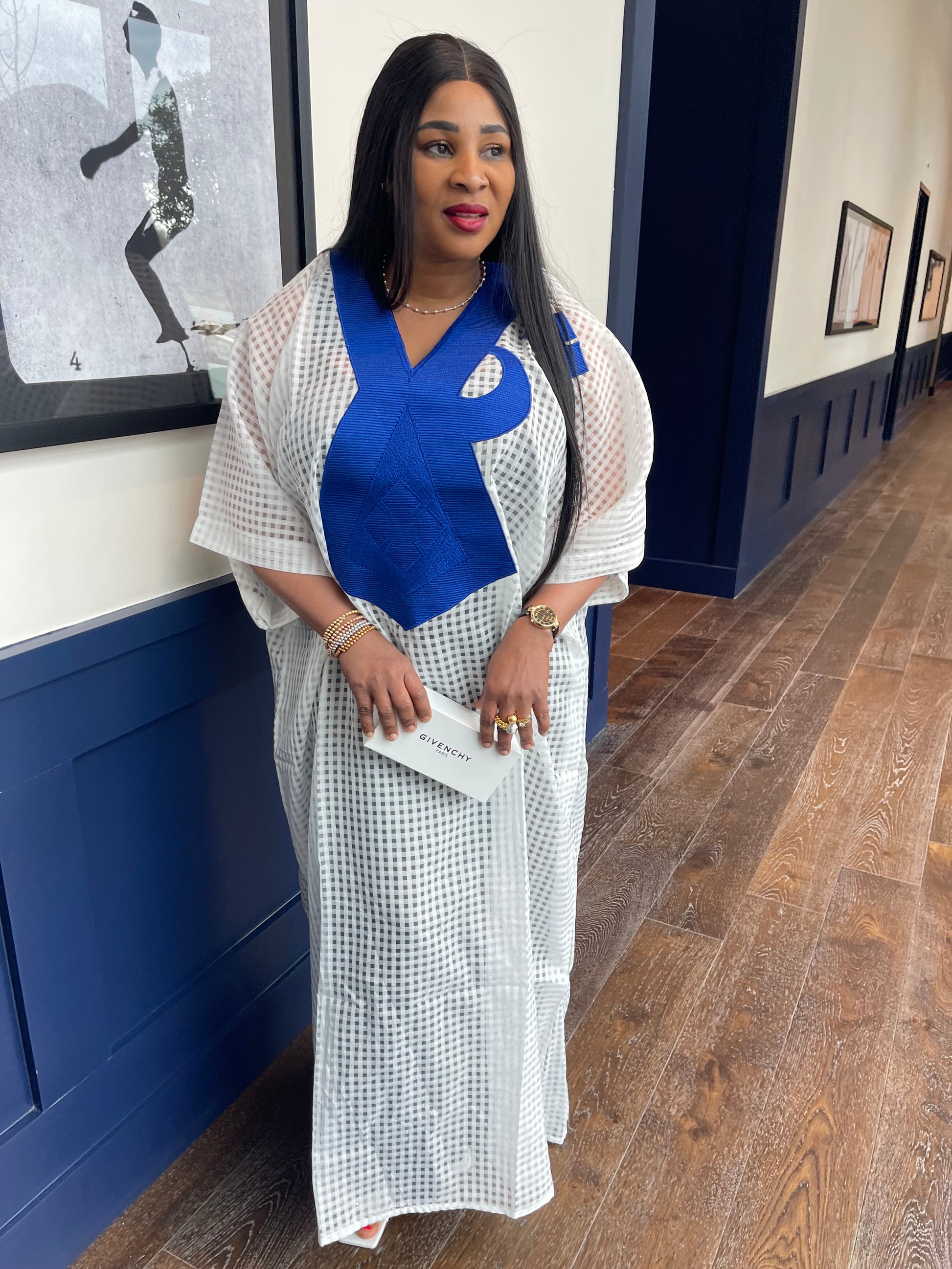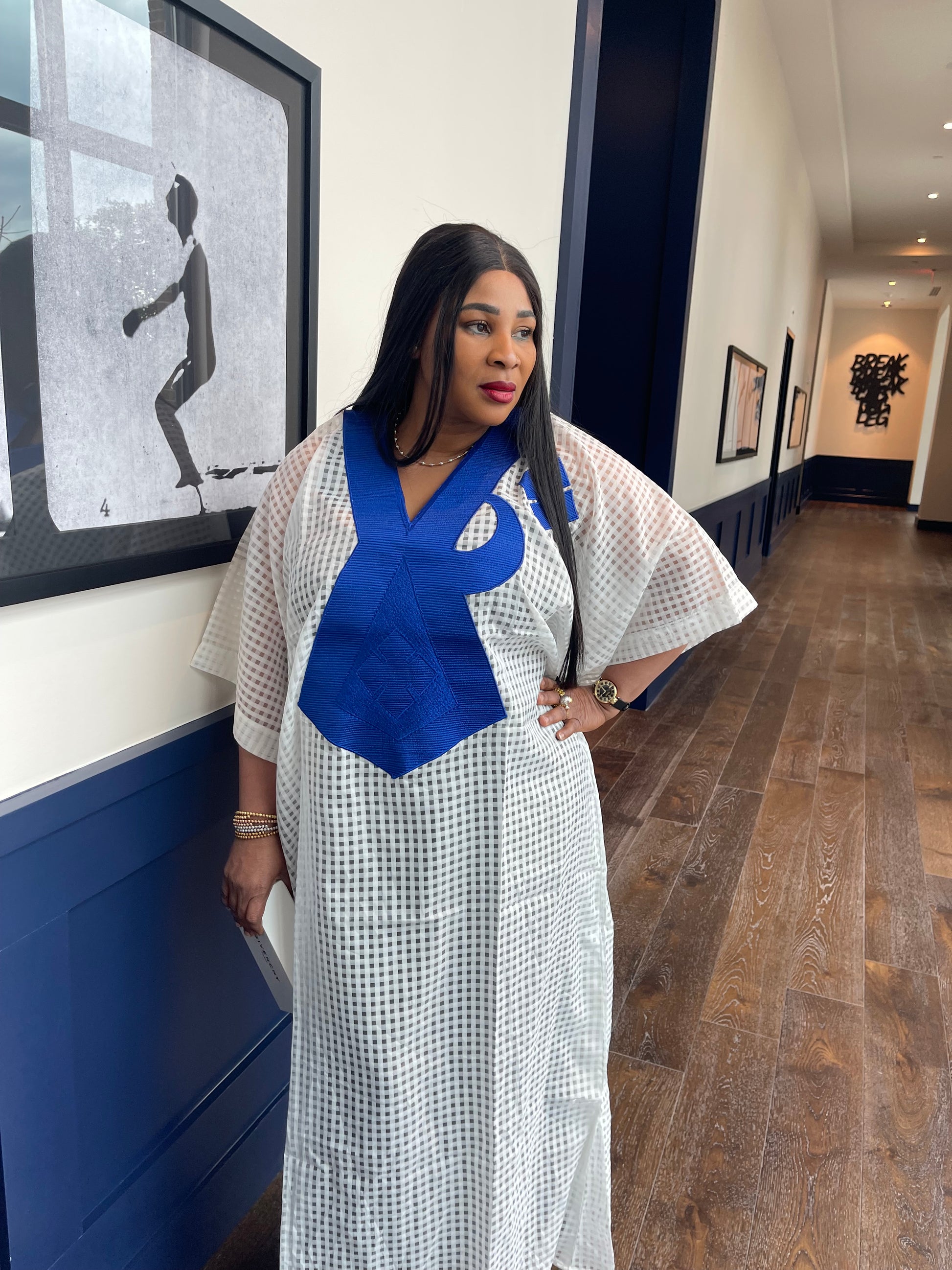 Introducing the KemKem Luxury Kaftan, a stunning white garment featuring intricate royal blue embroidery. Made from the finest materials, this kaftan exudes luxury and elegance. Perfect for any occasion, it will add a touch of refinement to your wardrobe. Elevate your style with KemKem.