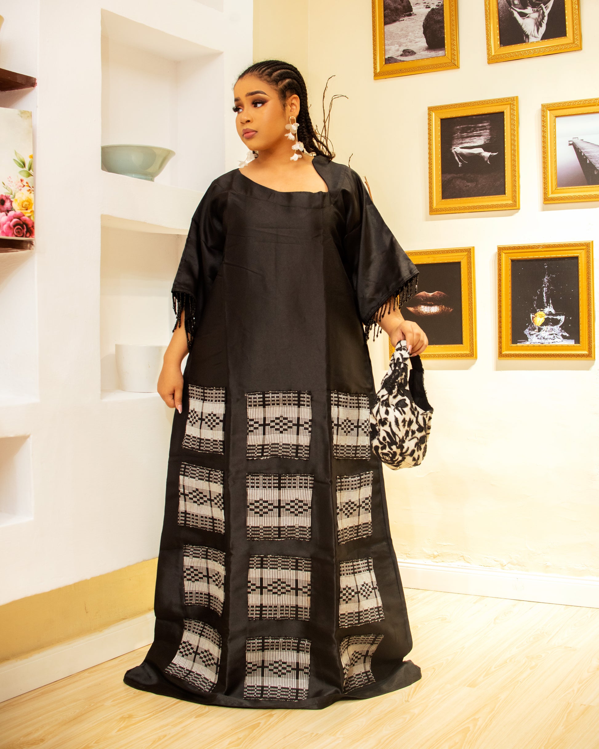 Expertly crafted with luxurious Mikado fabric, Labaké is adorned with elegant black crystals and traditional asoke patches. Elevate your style with this unique piece, perfect for any formal occasion.