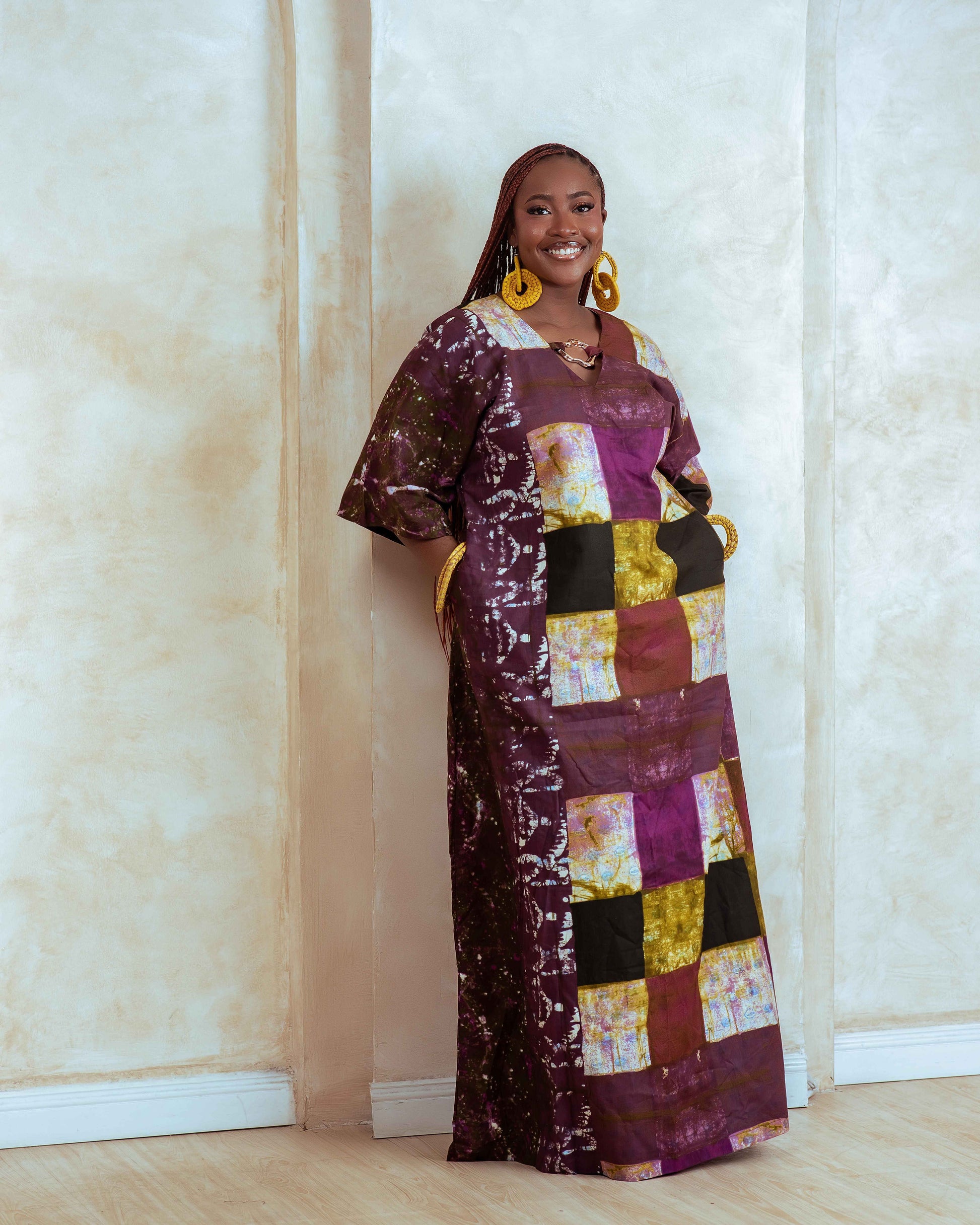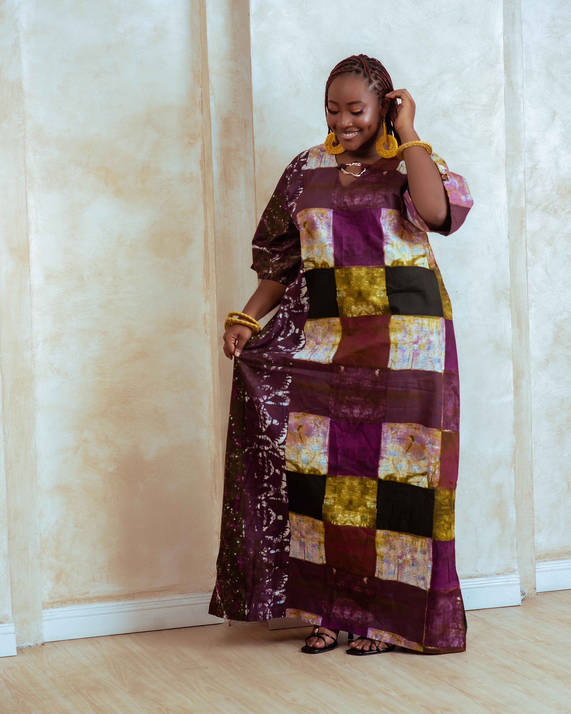 The Ara Ilé Kaftan is crafted from Adire fabric, known for its unique dyeing technique and cultural significance. It features elegant gold buckle details, enhancing not just aesthetics but also providing functional support. This combination ensures both comfort and a sophisticated appearance, ideal for various occasions.